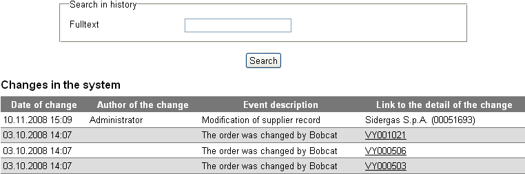 As Order Search, History report search function works the same way. Above all, this function enables you to note, when and which change has been made. You will find the last system changes on the Notice board, so you can use this function if you want to look “further into history”.