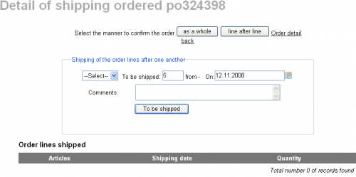 For larger orders it is possible to dispatch them line by line, or even in line parts. In this case you choose which product you want to dispatch. That moment system will automatically complete, what amount has been left (for example with consideration of dispatched amount). Fill up the amount which has been dispatched already, chose the dispatch date and again put some comments. After sending this partial record about dispatching, in the Dispatched lines overview appears a new line.