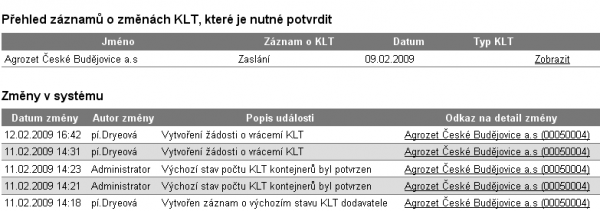 In the second overview, you will find a list of transactions and changes in the system of KLT returnable packages concerning your account and awaiting your reaction. As a rule, warnings of a new transaction, appeals for transaction confirmation etc. appear here. Prior to using the system of KLT returnable packages, we recommend that you visit the methodological website of the system, where you will learn more about the returnable packages process and the principle of their circulation.