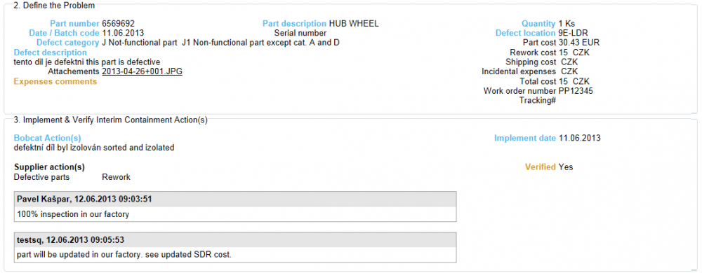 The 3D section must be Verified by Bobcat Quality. The verification means Bobcat is satisfied with the ICA details provided by Supplier. If Supplier doesn't respond in time to the SDR Bobcat might choose to rework the defective parts. In this case the status To be reworked in section 2D is changed to Yes and the SDR cost will be updated with the actual or expected rework cost.