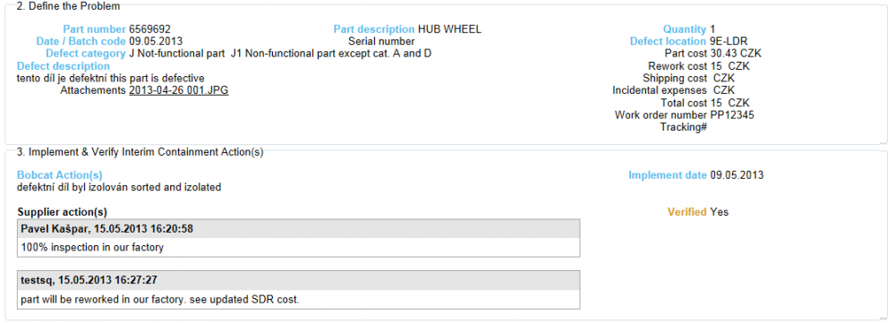 The 3D section must be Verified by Bobcat Quality. The verification means Bobcat is satisfied with the ICA details provided by Supplier. If Supplier doesn't respond in time to the SDR Bobcat might choose to rework the defective parts. In this case the status To be reworked in section 2D is changed to Yes and the SDR cost will be updated with the actual or expected rework cost.