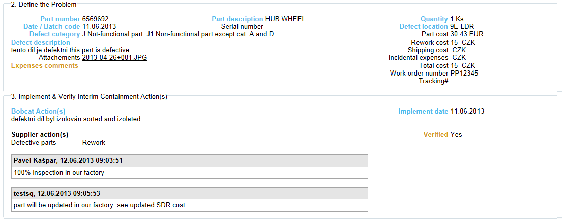 The 3D section must be Verified by Bobcat Quality. The verification means Bobcat is satisfied with the ICA details provided by Supplier. If Supplier doesn't respond in time to the SDR Bobcat might choose to rework the defective parts. In this case the status To be reworked in section 2D is changed to Yes and the SDR cost will be updated with the actual or expected rework cost.