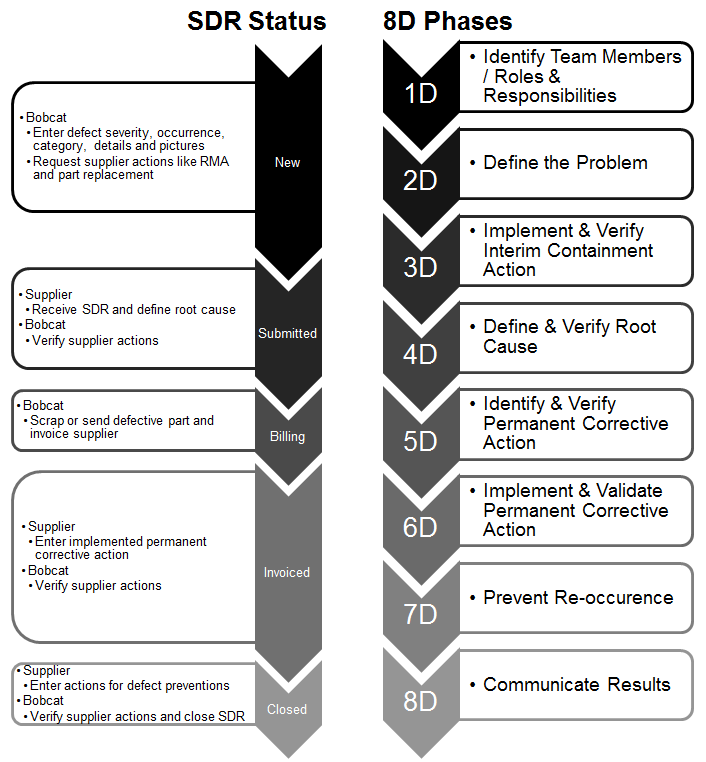 The Supplier Portal enforces standardized lifecycle for all Supplier Defect Reports (SDR). The SDR lifecycle is based around the industry standard methodology of problem solving technique called 8 Disciplines Problem Solving commonly known as 8D (more on 8D here: http://en.wikipedia.org/wiki/Eight_Disciplines_Problem_Solving). Together with 8D steps each SDR is assigned a status which is based on the immediate situation of the reported defect and content of the SDR record on the portal. The status of the SDR can be only changed/updated by Bobcat's responsible Supplier Quality Engineer and/or Accountant. Representatives of the Supplier can't change the SDR status.