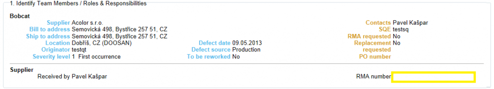 Below the thin line is displayed the name of Supplier responsible person to deal with the SDR and the box to enter the RMA number when requested by Bobcat.